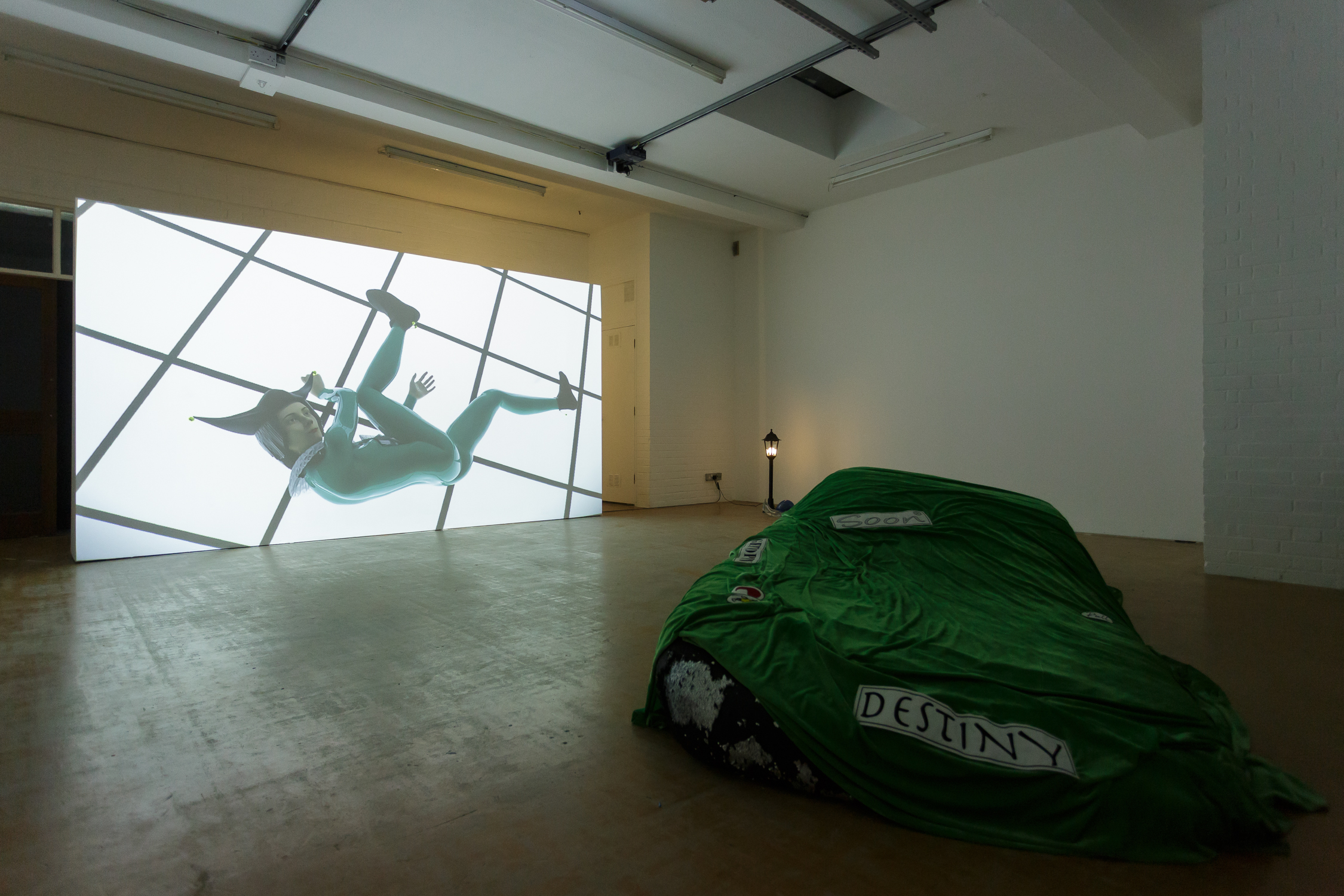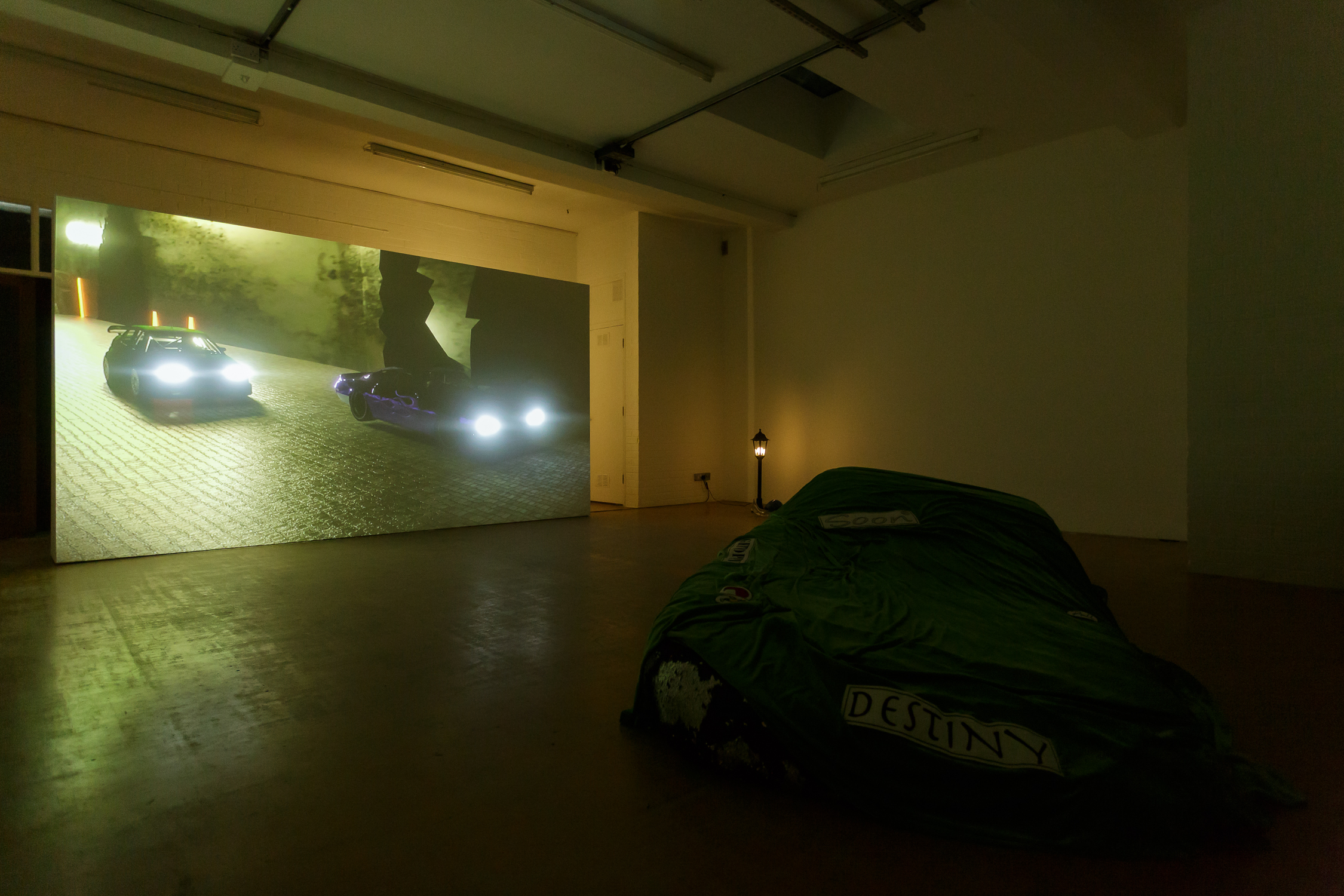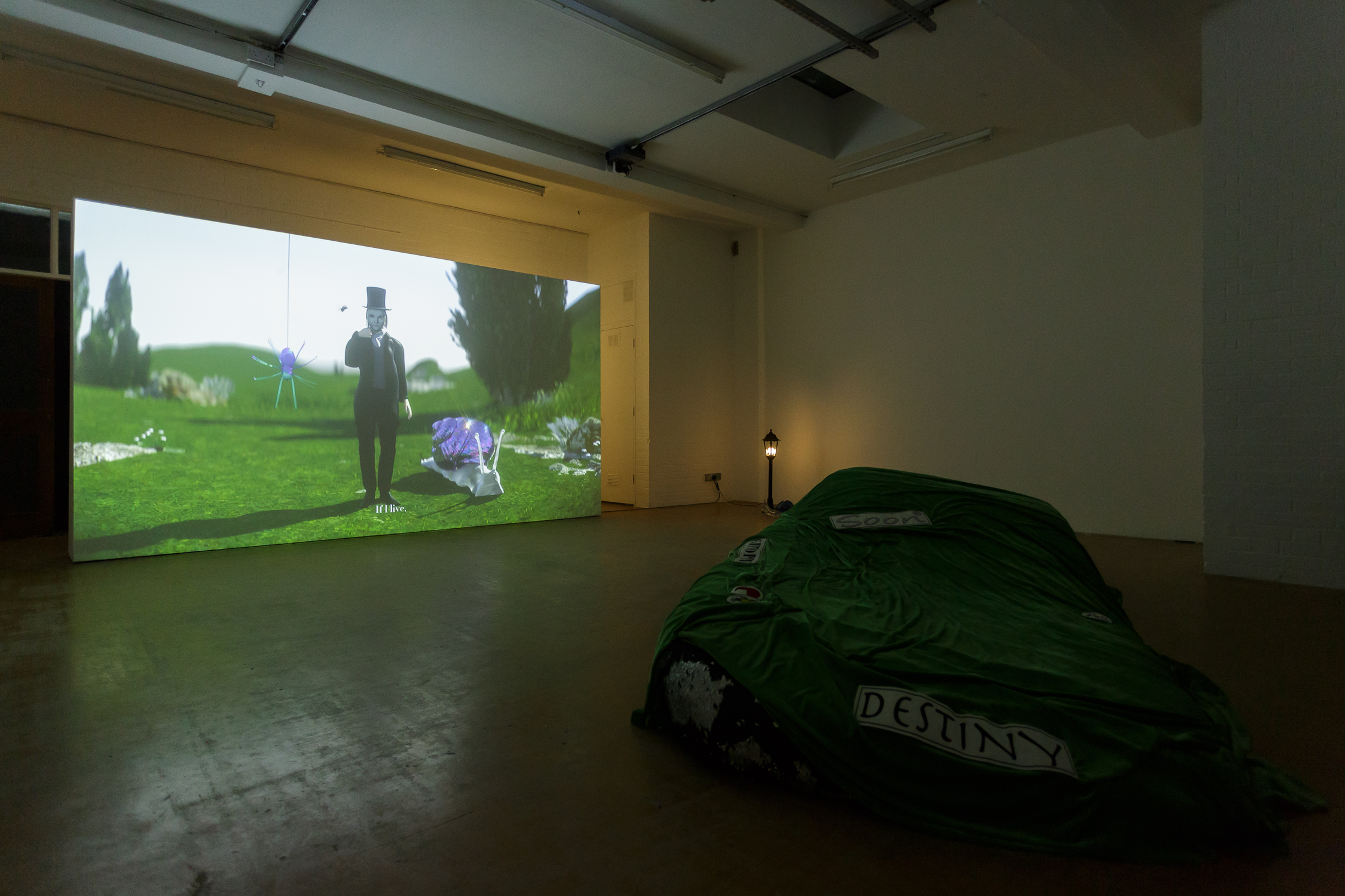 <The Jester & Death is an installation and animation which sees the Jester (Béna’s avatar) and William Blake attend a drift-car race. The scene takes place in the Bunhill Fields cemetery; a 16th-18th Century former burial ground located near Kunstraum where nonconformists, radicals and dissenters are buried, holding the remains of John Bunyan, author of The Pilgrim’s Progress, Daniel Defoe, who wrote Robinson Crusoe, and the poet and artist William Blake, among thousands of others.>