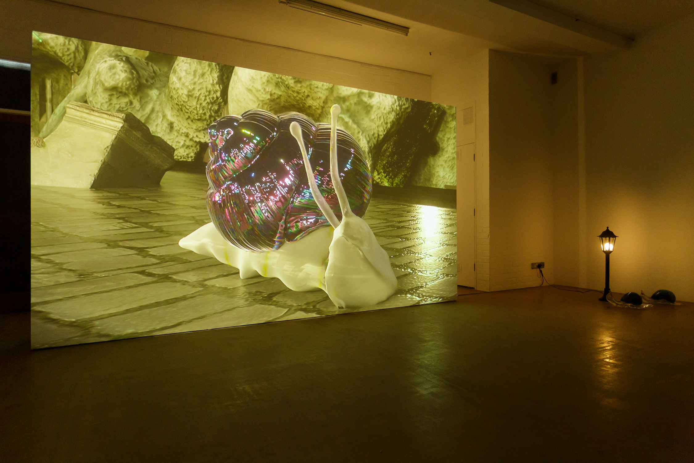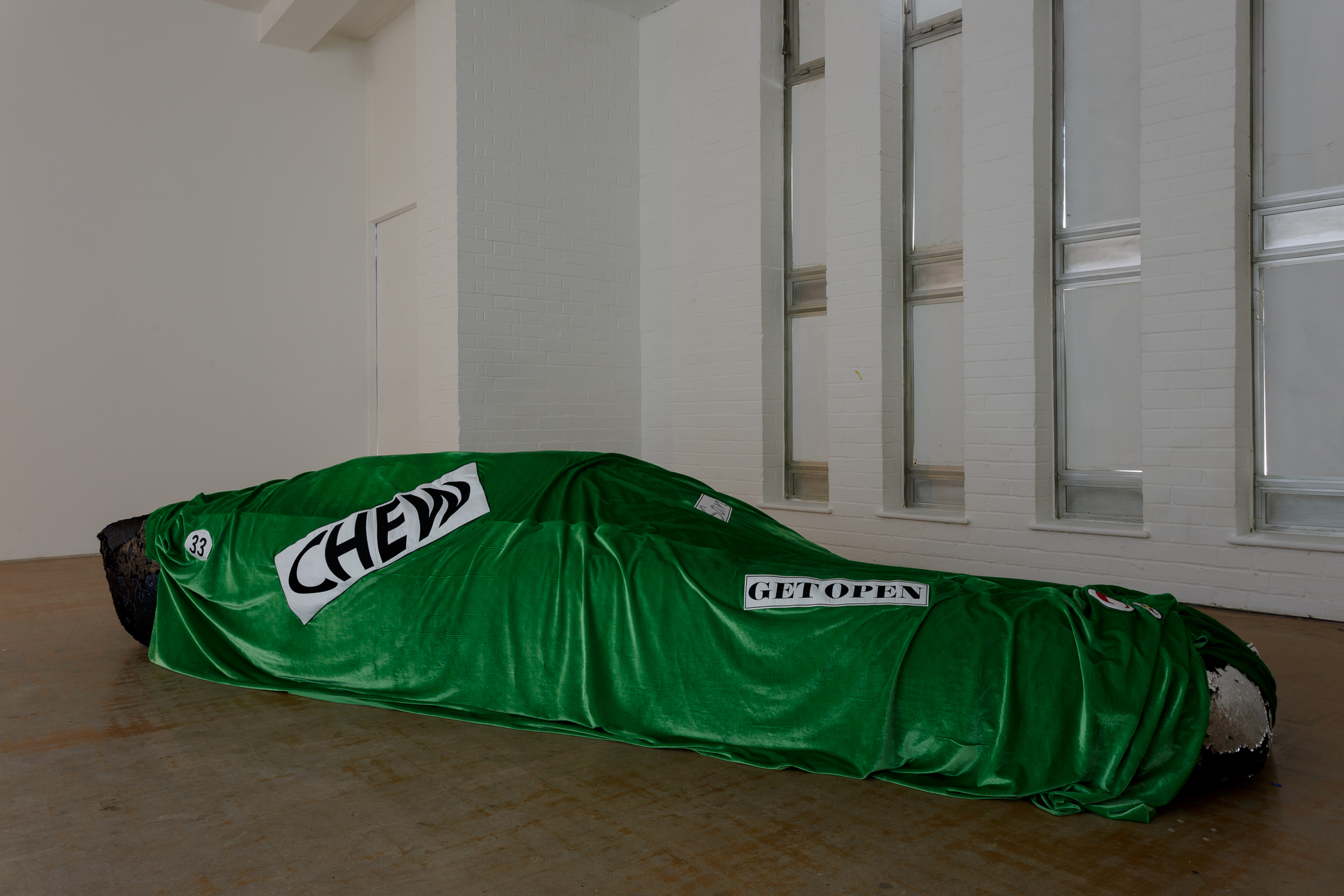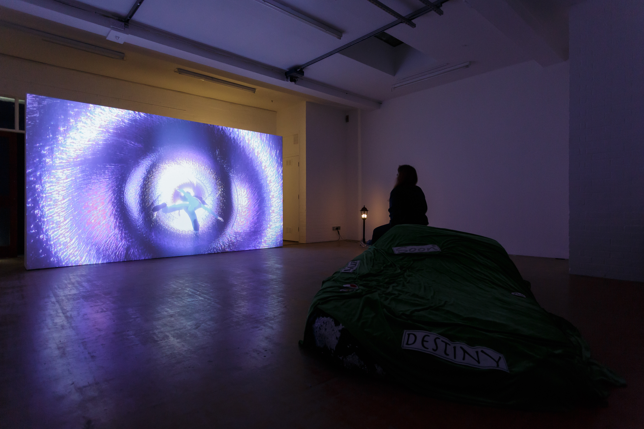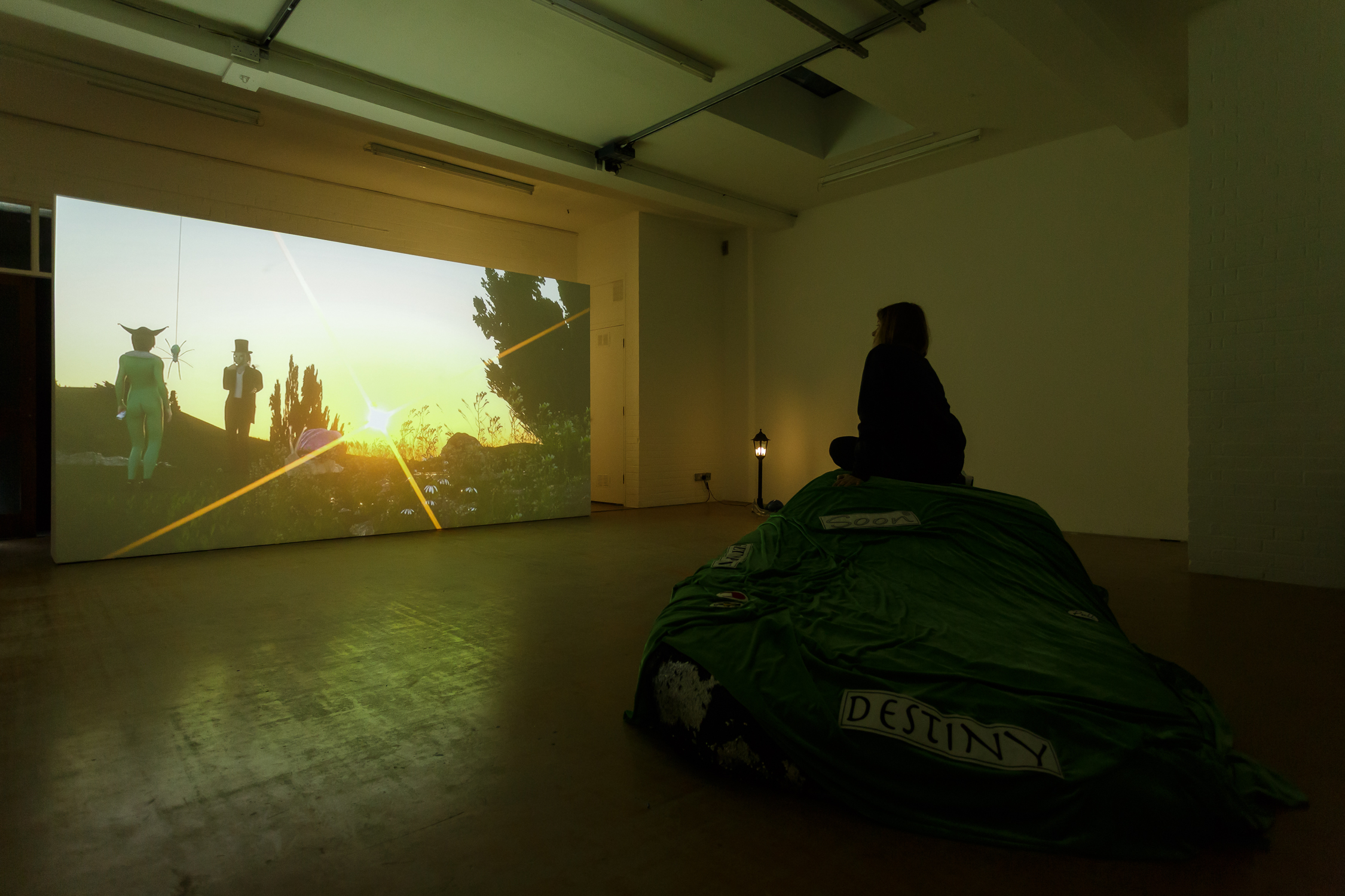 <The Jester & Death is an installation and animation which sees the Jester (Béna’s avatar) and William Blake attend a drift-car race. The scene takes place in the Bunhill Fields cemetery; a 16th-18th Century former burial ground located near Kunstraum where nonconformists, radicals and dissenters are buried, holding the remains of John Bunyan, author of The Pilgrim’s Progress, Daniel Defoe, who wrote Robinson Crusoe, and the poet and artist William Blake, among thousands of others.>
